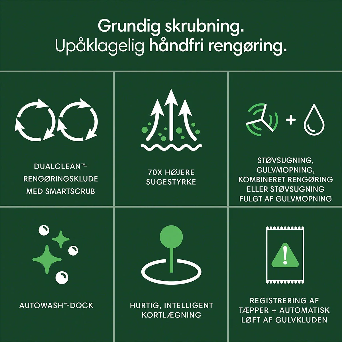 Automatisk tømning af støvbeholderen (kapacitet op til 75 dage) og automatisk vask og tørring af moppepuder (op til 4 uger uden vedligeholdelse). Mindre tid på vedligeholdelse, mere tid til det, der betyder noget! -
